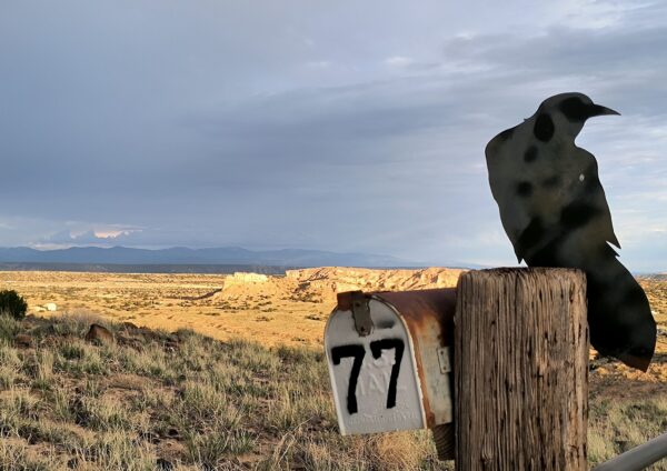 We live remotely and mail is delivered miles away to our Post Office box. The recycled mailbox at our gate is handy – a secure location to leave bake-goods and other items we exchange with the neighbors.  It’s very quiet and the views are expansive. To the east and 50 miles away are the Sangre de Christo mountains – the southern end of the Rockies, to the south are the Jemez Mountains and west we enjoy a clear view of  Pedernal. The ravens come by frequently, calling out as they fold their wings and flip over in a tight roll. The name of our place is the “Rolling Raven”.